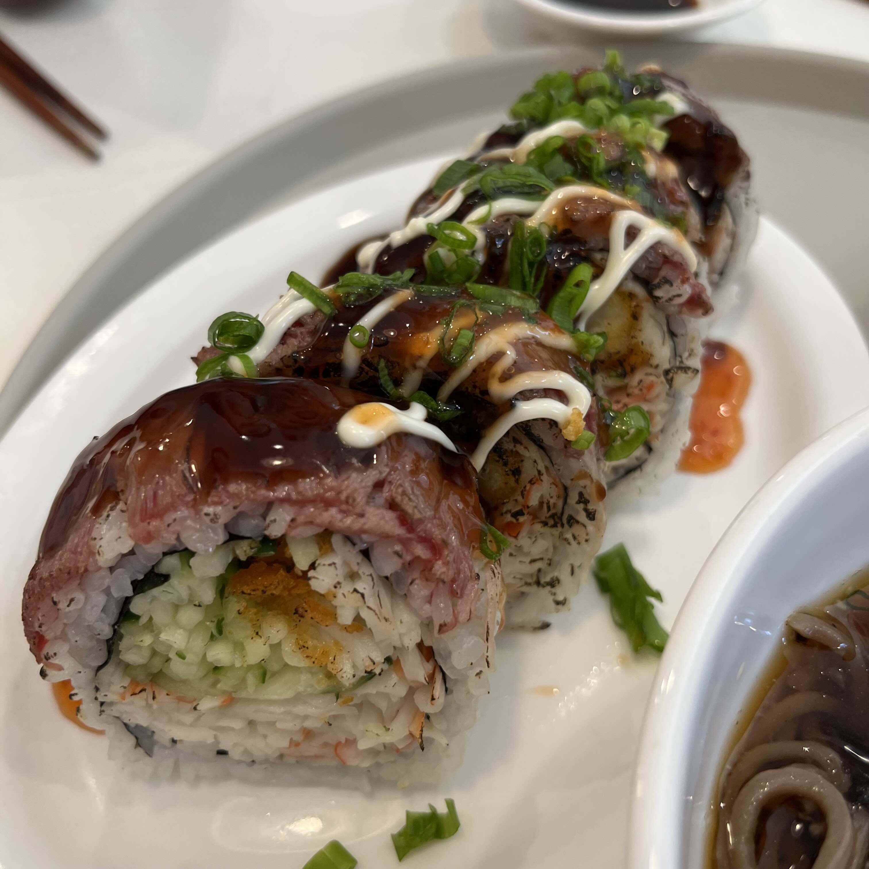소고기, 게살, 새우튀김, 오이, 스윗칠리, 마요로 만들어진 드래곤세트 이렇게 주문했는데